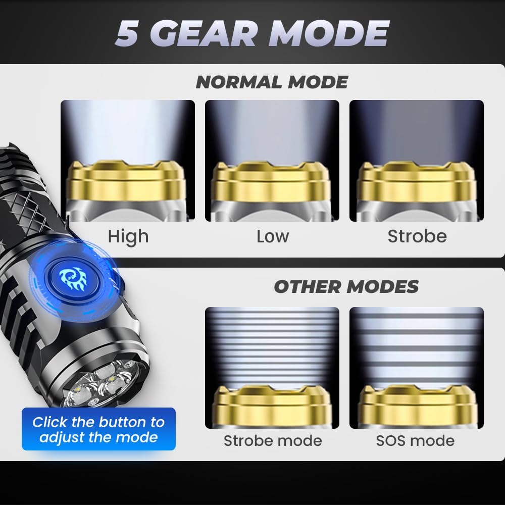 Switch between 5 modes—Strong, Medium, Weak, Flash, and SOS—to suit any situation. Perfect for everyday carry, emergencies, or outdoor adventures.